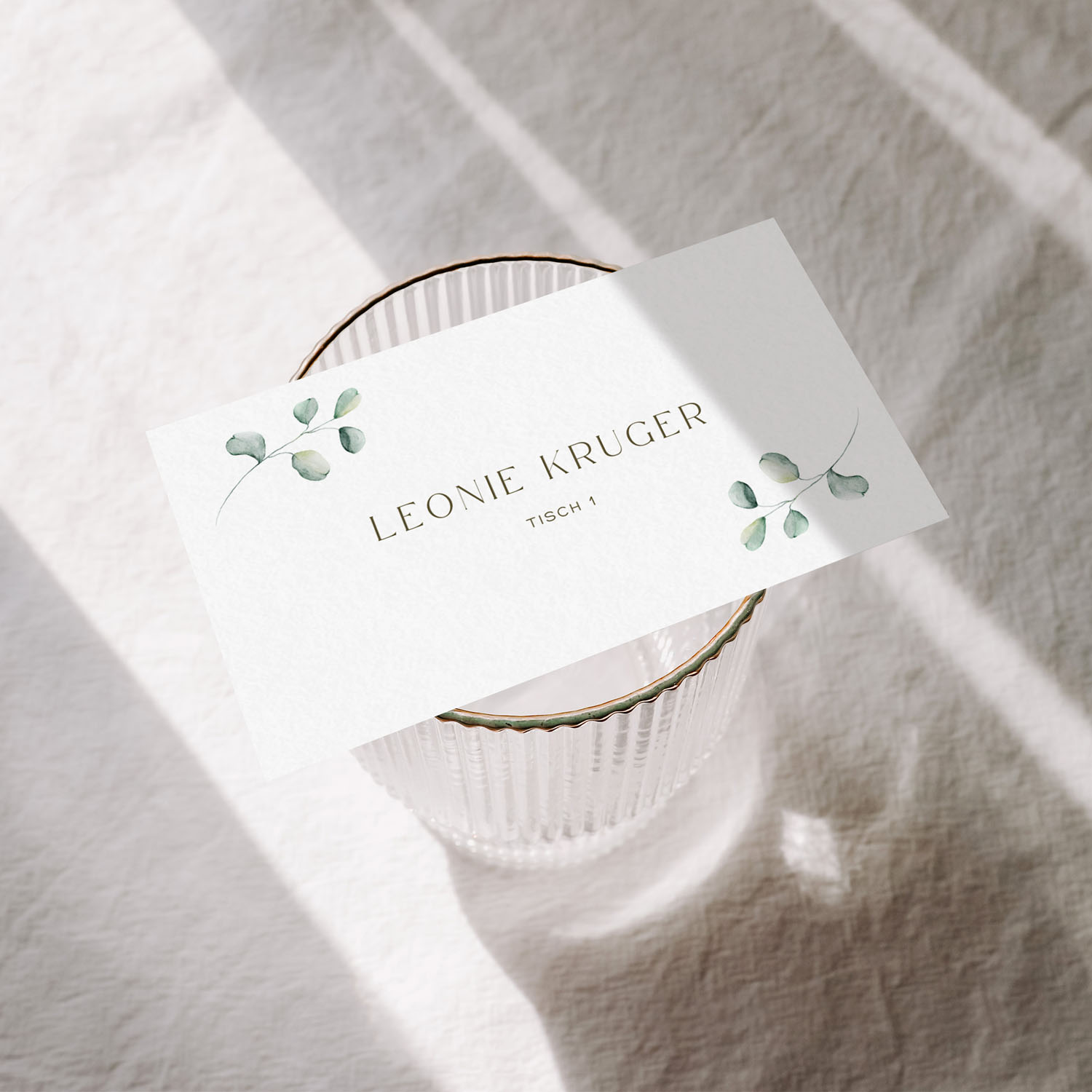 Namenskärtchen im Greenry-Stil mit Eukalyptusblättern für eure Hochzeit