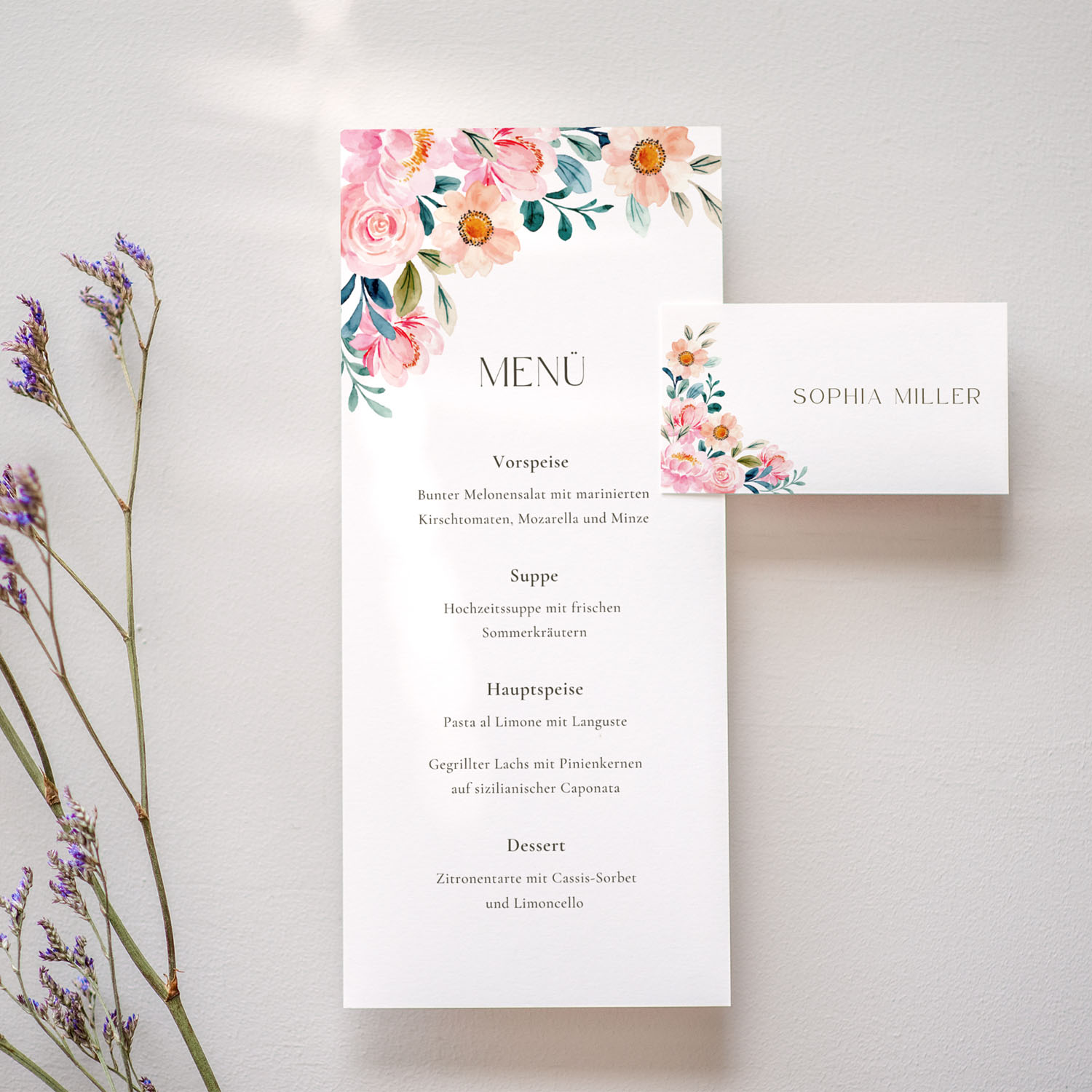 Die Platzkarten ROSELIA bezaubern mit zarten Blumen in Rosé- und Pfirsichtönen und bringen Leichtigkeit und Romantik auf euren Hochzeitstisch. Ob klassisch flach oder als praktische Klappkarte – beide Varianten lassen sich ganz einfach mit den Namen eurer Gäste personalisieren und sorgen für ein harmonisches Gesamtbild. Die perfekte Kombination aus Eleganz, Funktionalität und sommerlichem Design.