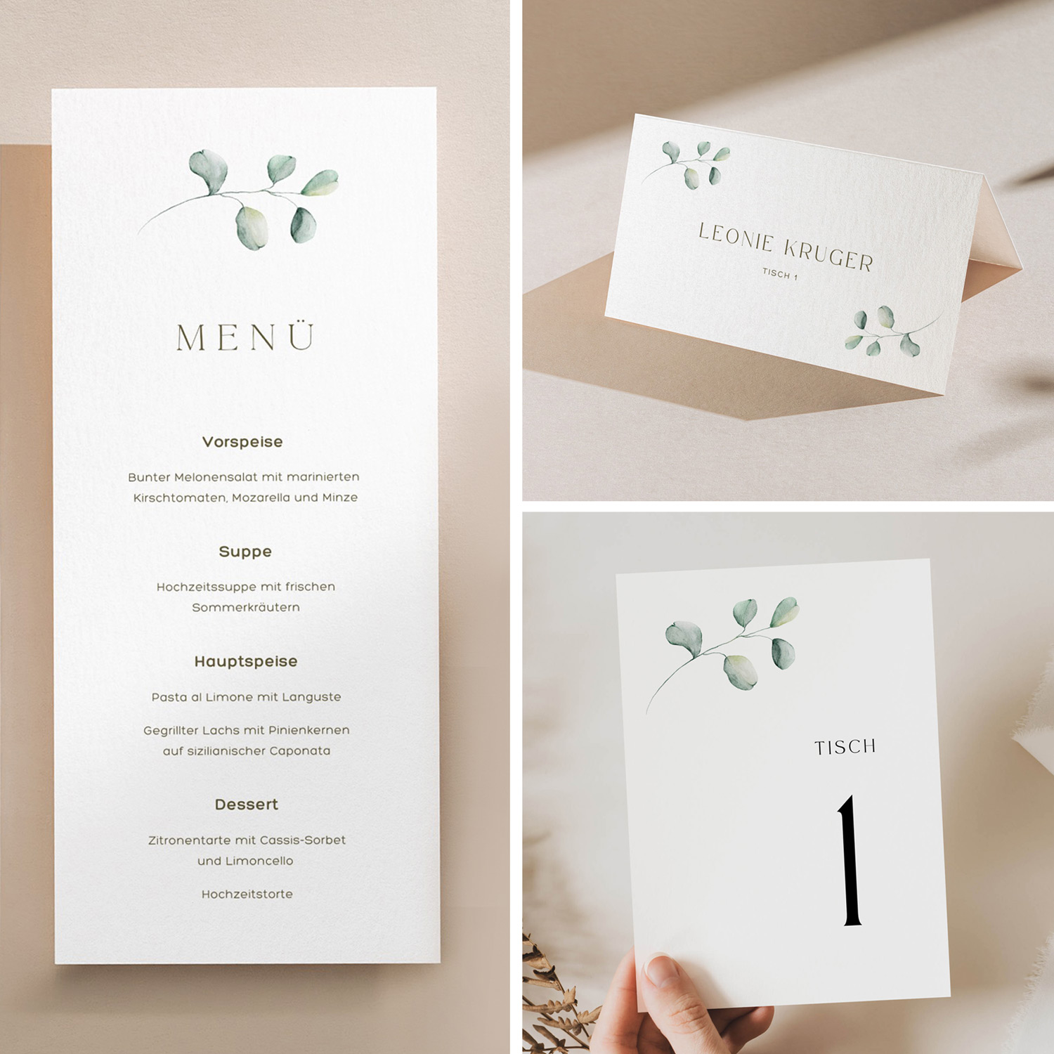 Greenery Hochzeitspapeterie Set mit Eukalyptus für eure Tischdekoration